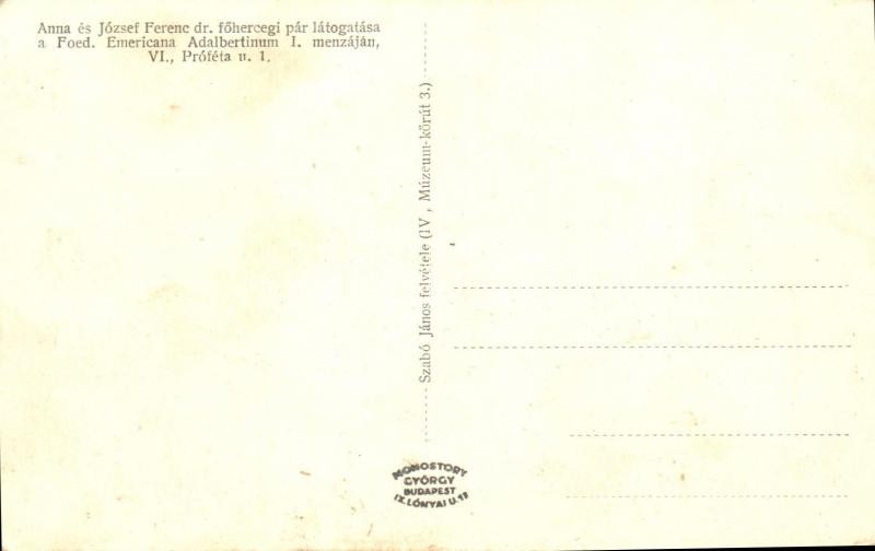 Budapest VIII. Anna és József Ferenc dr. főhercegi pár látogatása a Fo... https://www.darabanth.com/hu/306-Gyorsarveres/306.0/Kepeslapok/Magyarorszag~300005/Budapest-VIII-Anna-es-Jozsef-Ferenc-dr-fohercegi-par-latogatasa-a-Foederatio-Emericana-Adalb~II1204125