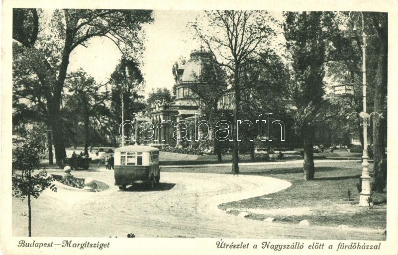 Leírás: Budapest XIII. Margitsziget, Út részlet a Nagyszálló előtt a fürdőházzal, autóbusz