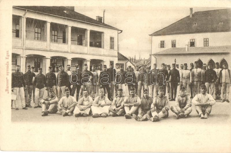 Eger, K.u.K. katonák a laktanya udvarán. Baross nyomda kiadása (EK) https://www.darabanth.com/hu/306-Gyorsarveres/306.0/Kepeslapok/Magyarorszag~300005/Eger-KuK-katonak-a-laktanya-udvaran-Baross-nyomda-kiadasa-EK~II1652673