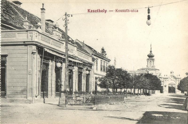 Keszthely, Kossuth utca, vendéglő terasz. Mérei Ignác kiadása https://www.darabanth.com/hu/306-Gyorsarveres/306.0/Kepeslapok/Magyarorszag~300005/Keszthely-Kossuth-utca-vendeglo-terasz-Merei-Ignac-kiadasa~II1655215