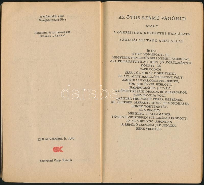 Leírás: Kurt Vonnegut: Az ötös számú vágóhíd. Olcsó Könyvtár. Bp.,1980, Szépirodalmi Könyvkiadó. Kiadói papírkötés, gyűrött borítóval, de belül jó állapotban.
