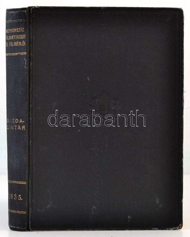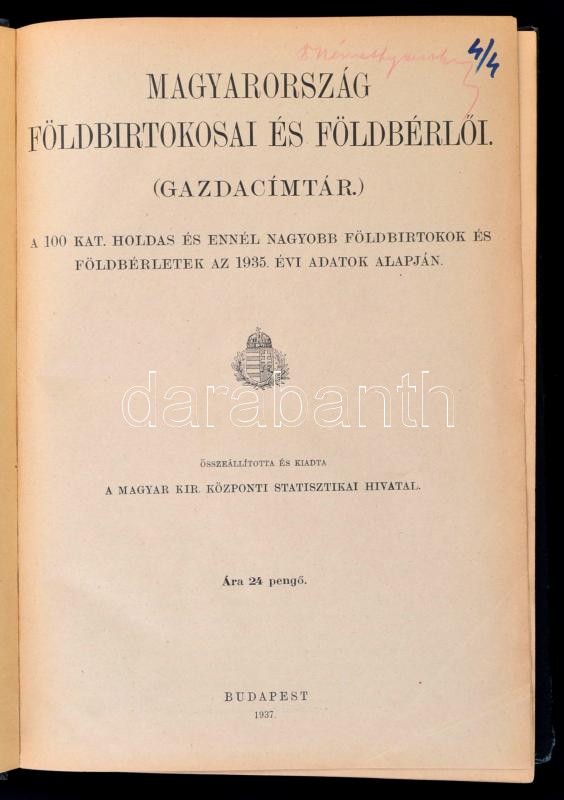Magyarország földbirtokosai és földbérlői. (Gazdacímtár.) A 100 kat.holdas és ennél nagyobb földbirtokok és földbérletek az 1935. évi adatok alapján. Összeáll.: Magyar Kir. Központi Statisztikai Hivatal. Bp., 1937, Franklin-Pátria. Kiadói egészvászon-kötés, kissé kopottas borítóval.