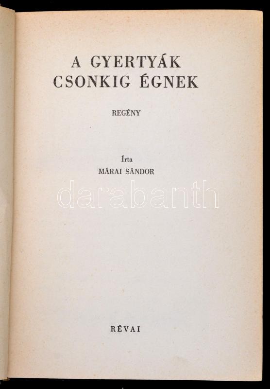 Márai Sándor: A gyertyák csonkig égnek. Bp., 1942, Révai. Kiadói egészvászon-kötés, kissé viseltes állapotban, kissé kopottas, kissé foltos borítóval, kissé sérüléssel a gerincen, kissé laza fűzéssel.