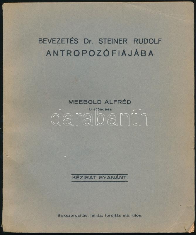 Meebold Alfréd: Bevezetés Dr. Steiner Rudolf antropozófiájában. Meebol... https://www.darabanth.com/hu/306-Gyorsarveres/306.0/Konyvek/Konyvek-Egyeb-ritkasagok~500018/Meebold-Alfred-Bevezetes-Dr-Steiner-Rudolf-antropozofiajaban-Meebold-Alfred-6-eloadasa-K~II1653533