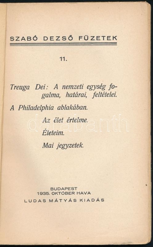 Szabó Dezső: Treuga Dei: A nemzeti egység fogalma, határai, feltételei. A Philadelphia ablakában. Az élet értelme. Életeim. Mai jegyzetek. Szabó Dezső Füzetek 11. Bp., 1935, Ludas Mátyás. Kiadói papírkötés. Jó állapotban.