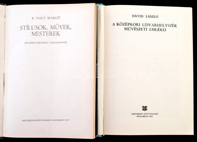 B. Nagy Margit: Stílusok, művek, mesterek. Művészettörténeti tanulmányok. Bukarest, 1977, Kriterion. Kiadói egészvászon-kötés, kiadói papír védőborítóban.