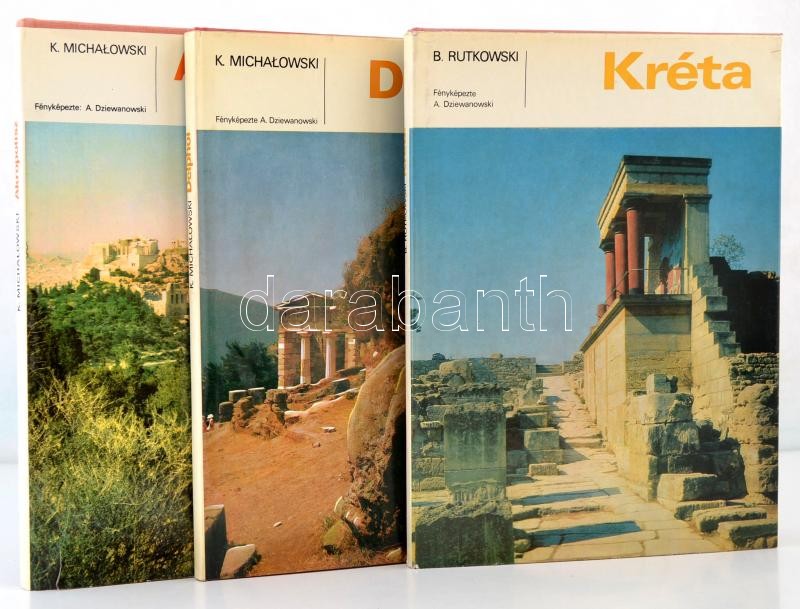 Vegyes könyvtétel, Az ókor művészete és kultúrája sorozatból, 3 db: Kazimierz Michalowski: Delphoi. FordÃtotta: Técsy Judit. Bp., 1978, Corvina. Kiadói egészvászon-kötés, kiadói papÃr védÅ‘borÃtóban. Kazimierz Michalowski: Akropolisz. FordÃtotta: Dobos LÃdia. Bp., 1981, Corvina. Kiadói egészvászon-kötés, kiadói papÃr védÅ‘borÃtóban. Bogdan Rutkowski: Kréta. FordÃtotta: Dobos LÃdia. Bp., 1979, Corvina. Kiadói egészvászon-kötés, kiadói papÃr védÅ‘borÃtóban.