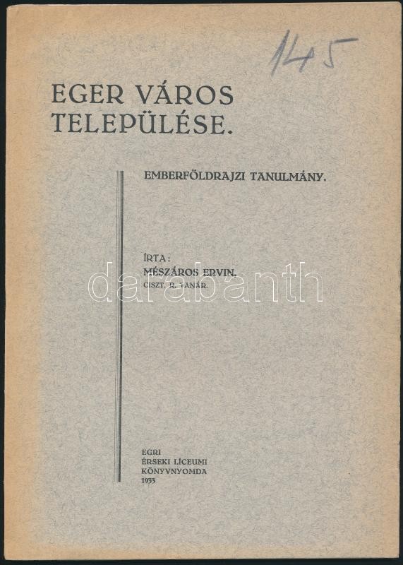 Mészáros Ervin: Eger város települése. Emberföldrajzi tanulmány. Eger,... https://www.darabanth.com/hu/306-Gyorsarveres/306.0/Konyvek/Konyvek-Utazas-helytortenet~500001/Meszaros-Ervin-Eger-varos-telepulese-Emberfoldrajzi-tanulmany-Eger-1933-Erseki-Liceumi~II1650757