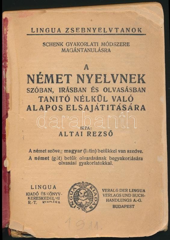 Altai Rezső: A német nyelvnek szóban, írásban és olvasásban tanító nélkül való alapos elsajátitására. Lingua zsebnyelvtanok. Bp., (1911), Lingua Kiadó és Könyvkereskedelmi Rt. Kiadói papírkötés, kopottas, a borító egyik sarka sérült, hiányos.