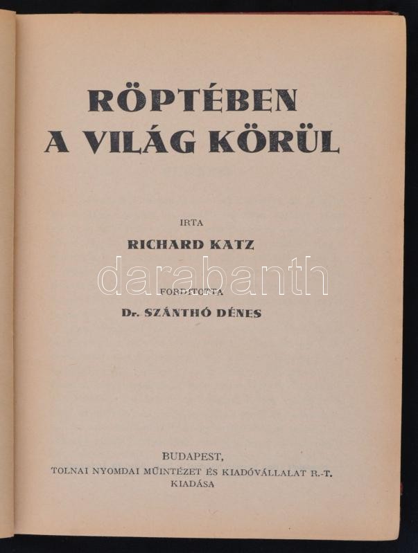 Richard Katz: Röptében a világ körül. Fordította Dr. Szántó Dénes. Bp., é.n., Tolnai. Fekete-fehér fotókkal illusztrálva. Kiadói félvászonkötésben, kopottas borítóval, de egyébként jó állapotban.