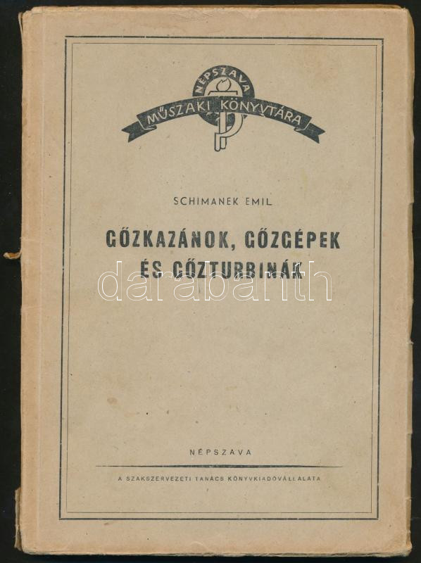 Leírás: Schimanek Emil: Gőzkazánok, gőzgépek, és gőzturbinák. Tájékoztató a gőzüzemű erőművek üzemi viszonyairól. Budapest, 1950, Népszava. Kiadói papírkötésben, szakadozott borítóval.