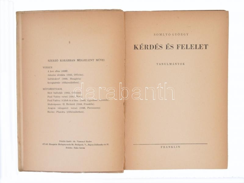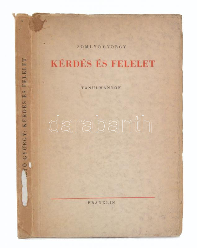 Leírás: Somlyó György: Kérdés és felelet. Tanulmányok. Budapest, é.n., Franklin. Kiadói papírkötés, foltos borítóval, de egyébként jó állapotban.