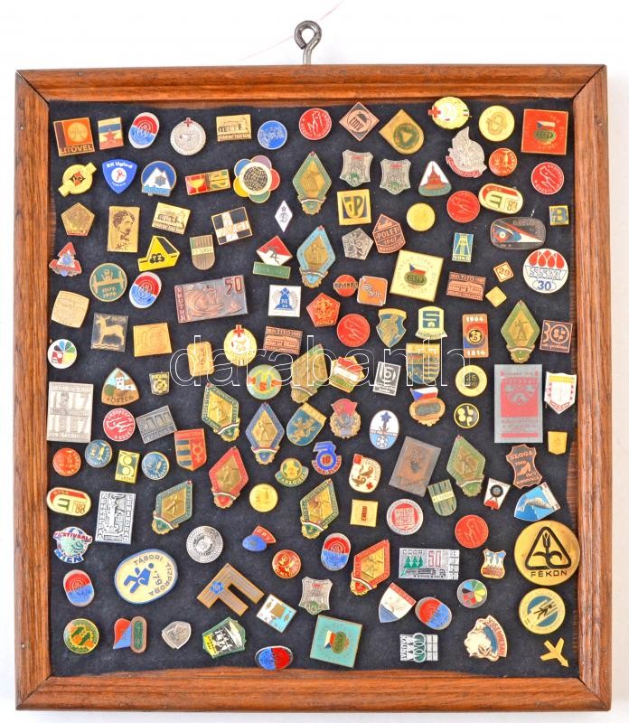 ~150db-os vegyes magyar és külföldi jelvény és kitűző tétel falra akasztható fa keretben, főleg a szocializmus időszakából, néhány érdekesebb darabbal is (értéke a tulajdonos szerint ~50.000Ft) T:1-,2,2-
