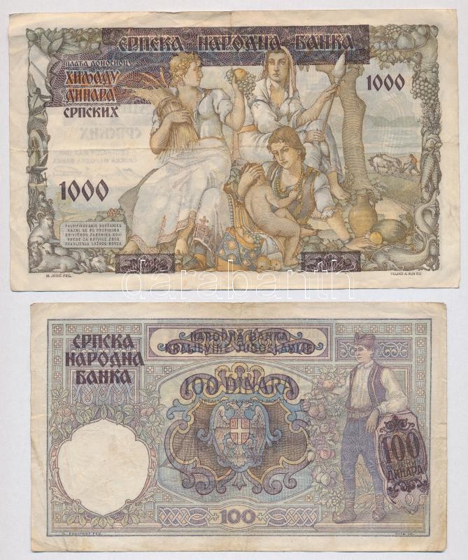 Serbia / German occupation 1941. 100 Dinara + 1000 Dinara both printed on Yugoslavian banknotes C:F,VG