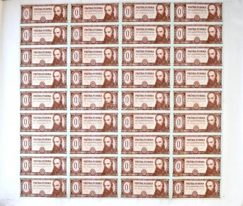 1973. Táncsics 01 "PRÓBA FORMA" előlap kész, hátlap üres, barna nyomat, zöld papír, 36db-os teljes ívben T:I- feltekert, hajtatlan, széleken gyűrűsédekkel Hungary 1973. Táncsics 01 "PRÓBA FORMA" unissued banknote design, front proof, backside empty, brown print on green paper, in sheet of 36 C:AU rolled up, unfolded, creases on the edges Adamo SFT2.2.5