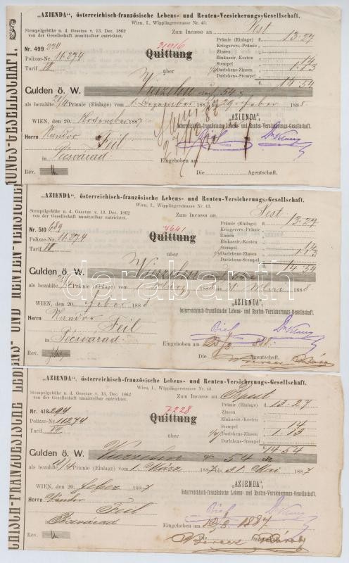 Ausztria / Bécs 1883-1889. "AZIENDA österreichisch-französische Lebens- und Rentenversicherungs-Gesellschaft (AZIENDA Osztrák-Francia Élet- és Nyugdíjbiztosítási Társaság)" nyugta (24x) mind kitöltött T:III