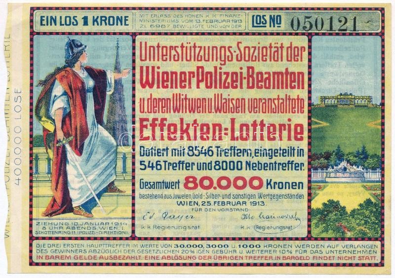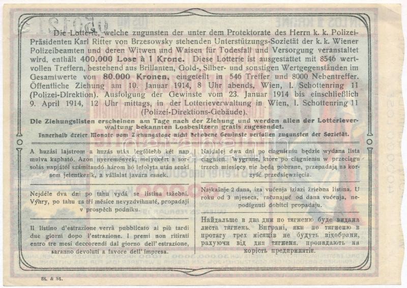 Austria 1913. "Unterstützungs-Sozietat der Wiener Polizei-Beamten" lottery ticket with the price of 1 Krone C:XF