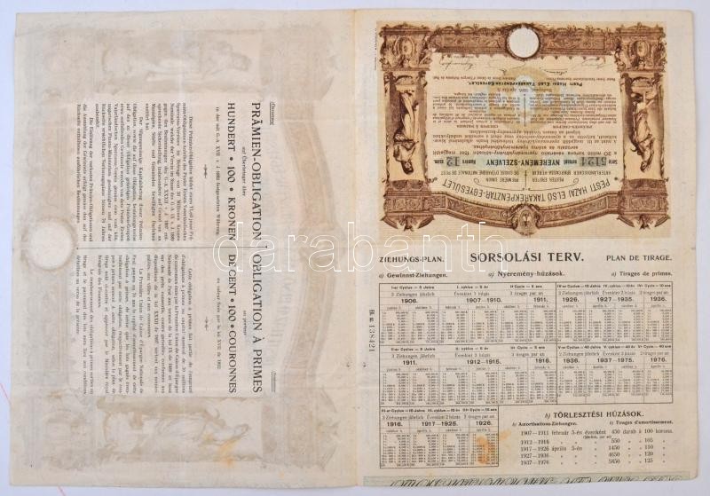 Leírás: Budapest 1906. "Pesti Hazai Első Takarékpénztár-Egyesület" nyereménykötvénye 100K-ról, szárazpecséttel, nyereményszelvénnyel T:III