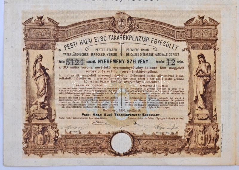 Budapest 1906. "Pesti Hazai Első Takarékpénztár-Egyesület" n... https://www.darabanth.com/hu/306-Gyorsarveres/306.0/Numizmatika/Reszvenyek-es-sorsjegyek~200005/Budapest-1906-Pesti-Hazai-Elso-Takarekpenztar-Egyesulet-nyeremenykotvenye-100K-rol-sza~II1655904