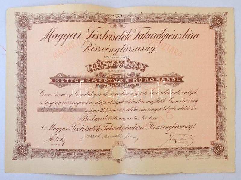 Leírás: Budapest 1910. "Magyar Tisztviselők Takarékpénztára Részvénytársaság" bemutatóra szóló részvénye 250K-ról, szárazpecséttel és szelvényekkel T:II-
