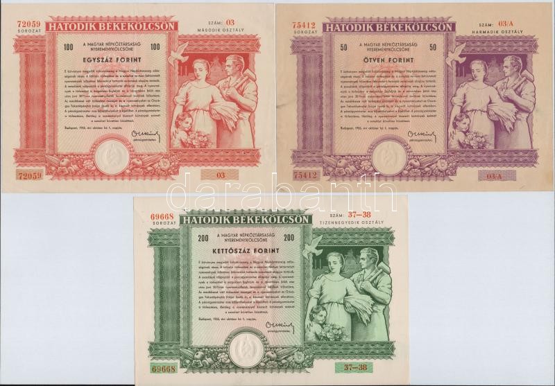 Budapest 1955. "Hatodik Békekölcsön" nyereménykölcsön 50, 10... https://www.darabanth.com/hu/306-Gyorsarveres/306.0/Numizmatika/Reszvenyek-es-sorsjegyek~200005/Budapest-1955-Hatodik-Bekekolcson-nyeremenykolcson-50-100-es-200Ft-rol-3xklf-mind-sza~II1655864
