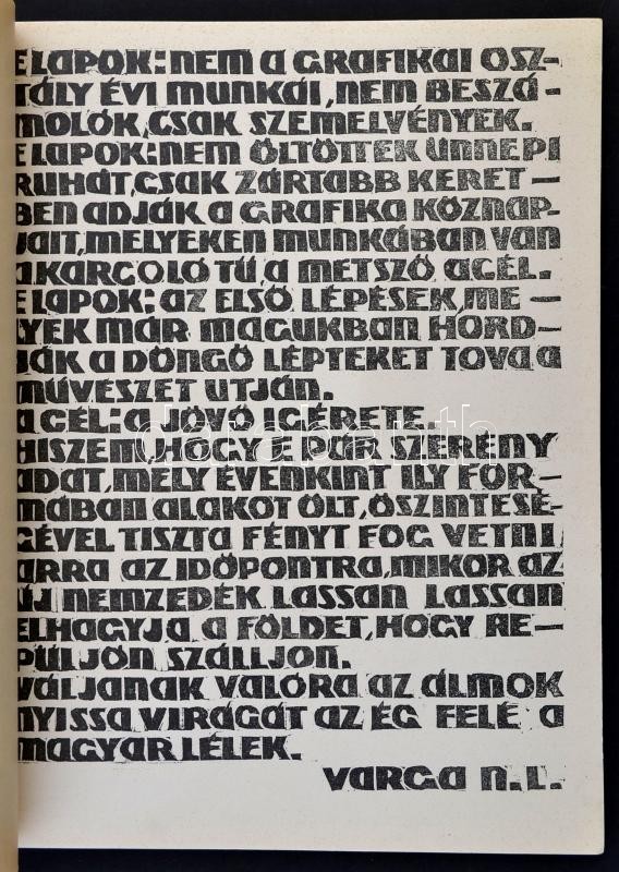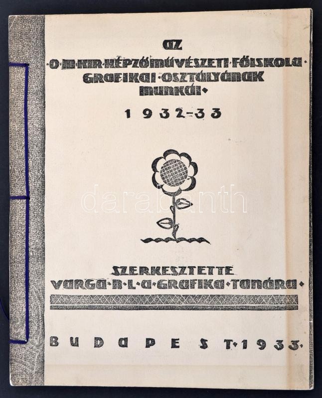 z O. M. Kir. Képzőművészeti Főiskola Grafikai Osztályának munkái. 1932-33. Szerk. Varga Nándor Lajos. Bp., 1933, M. Kir. Képzőműv. Főisk. 3 sztl. lev., 23t. (ebből 8 fa-, 9 linómetszet, 6 rézkarc), 21 sztl. lev. (feliratozott hártyapapír), 1 sztl. lev. Andor Lóránd: (2 fa-, 1 linómetsz.); Ábrán Azra: (1 fa-, 1 linómetsz.); Bartha László: (1 rézkarc); Endrédy György: (1 linómetsz.); Élesdy István: (1 fa-, 1 linómetsz., 1 rézkarc); Gadányi Ferenc: (1 rézkarc); Iván Szilárd: (2 fa-, 1 linómetsz., 1 rézkarc); Koffán Károly: (1 rézkarc); Kürz János: (1 linómetsz.); László Gyula: (1 fa-, 1 linómetsz.); Metykó Gyula (1 linómetsz.); és Patay Mihály: (1 fa, 1 linómetsz., 1 rézkarc). Zsinórfűzéssel, kiadói borítóban. Hibátlan állapotban.