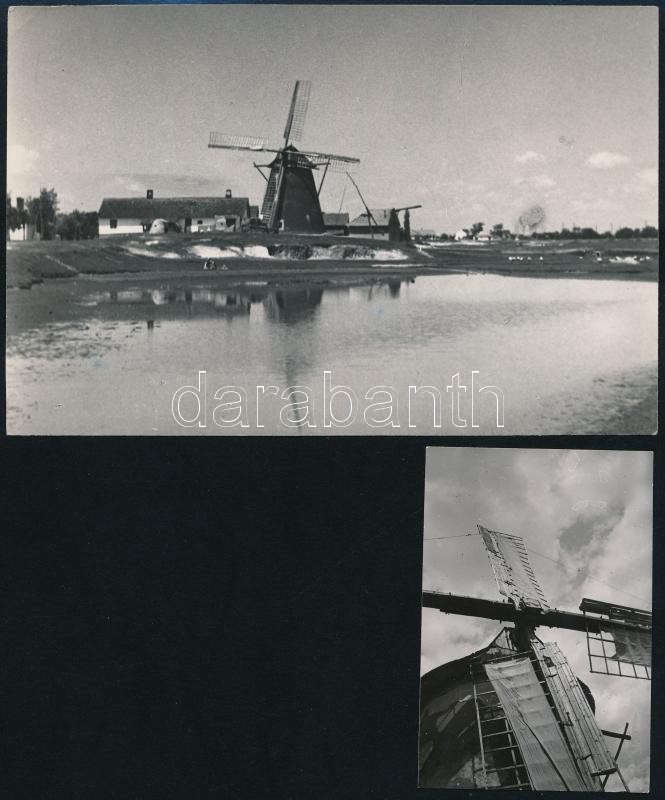 1936 Szélmalmok Szentesen és (Kiskun)Halason, 2 db feliratozott, vintage fotó Kerny István (1879-1963) budapesti fotóművész hagyatékából, 8,5x6 cm és 11x16 cm / windmill, 2 photom of István Kerny, 8,5x6 and 11x16 cm