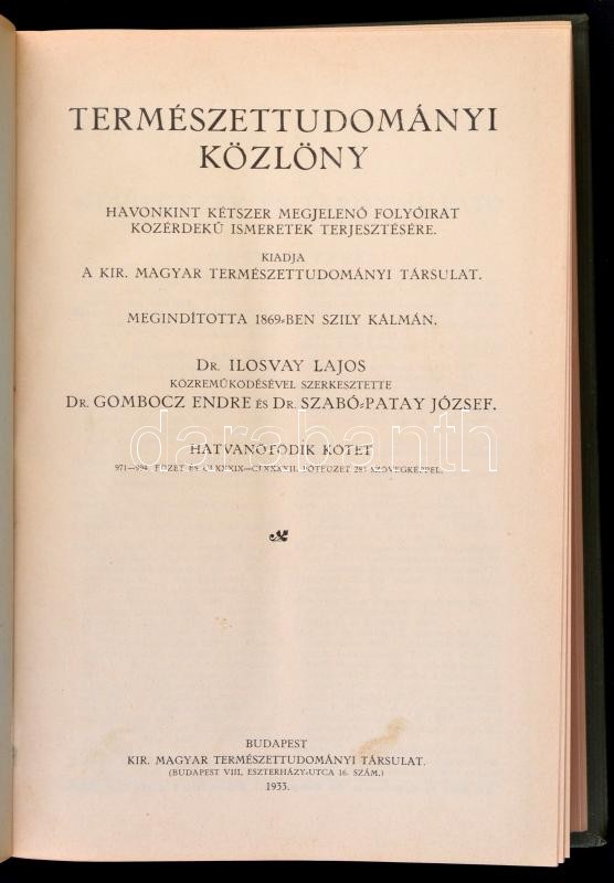 1933 Természettudományi Közlöny, 65. köt., teljes évfolyam egybekötve,... https://www.darabanth.com/hu/307-Gyorsarveres/307.0/Festmeny-mutargy-papirregiseg-egyeb/Nyomtatvanyok~30/1933-Termeszettudomanyi-Kozlony-65-kot-teljes-evfolyam-egybekotve-kicsit-kopott-vaszonk~II1662523