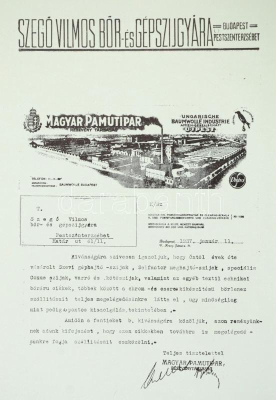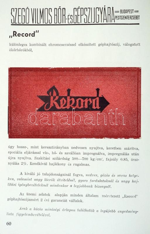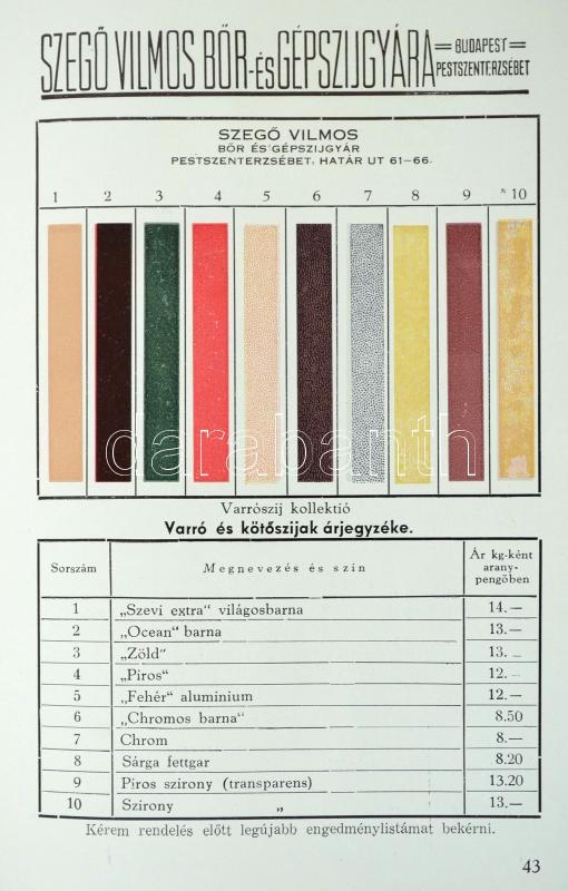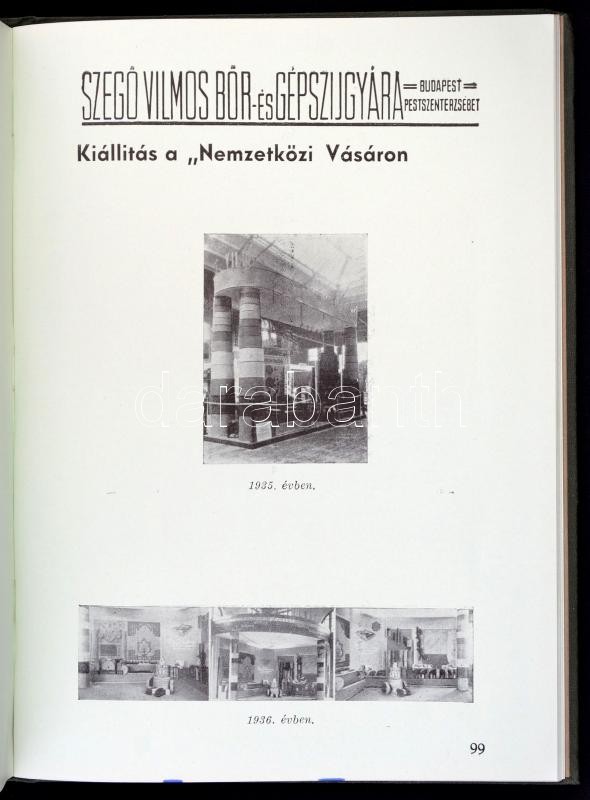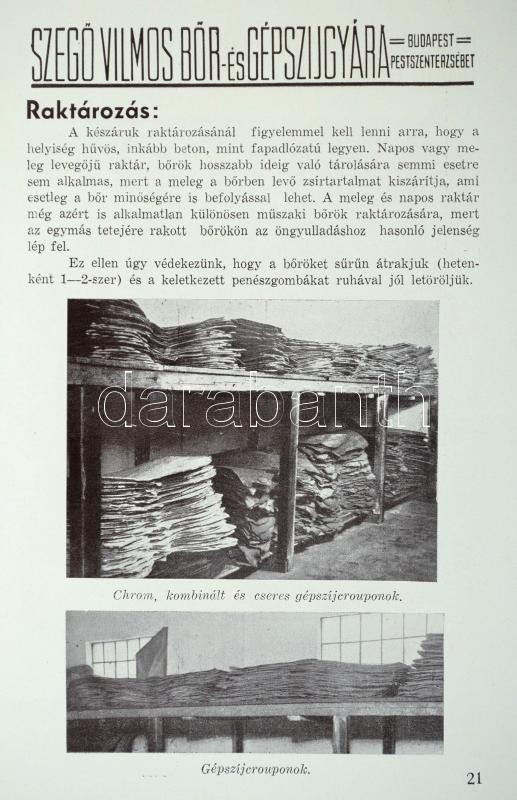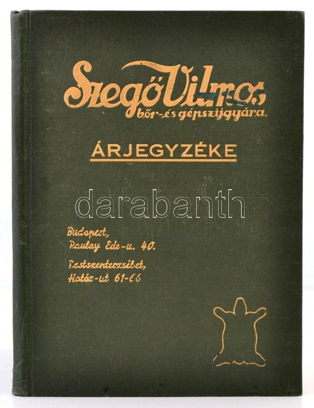 1937 Szegő Vilmos bőr és gépszíjgyárának árjegyzéke. Bp., Kiss Gyula és Társa Törekvés Nyomdája, 123 p. Kiadói aranyozott egészvászon-kötés, szövegközti fekete-fehér fotókkal, illusztrációkkal. Szép állapotban.