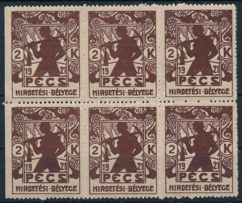 Leírás: 1921 Pécs Hirdetési bélyeg 2K 6-os tömbben, a bal oldali 2 bélyeg 1-1 oldalon vágott (9.900)