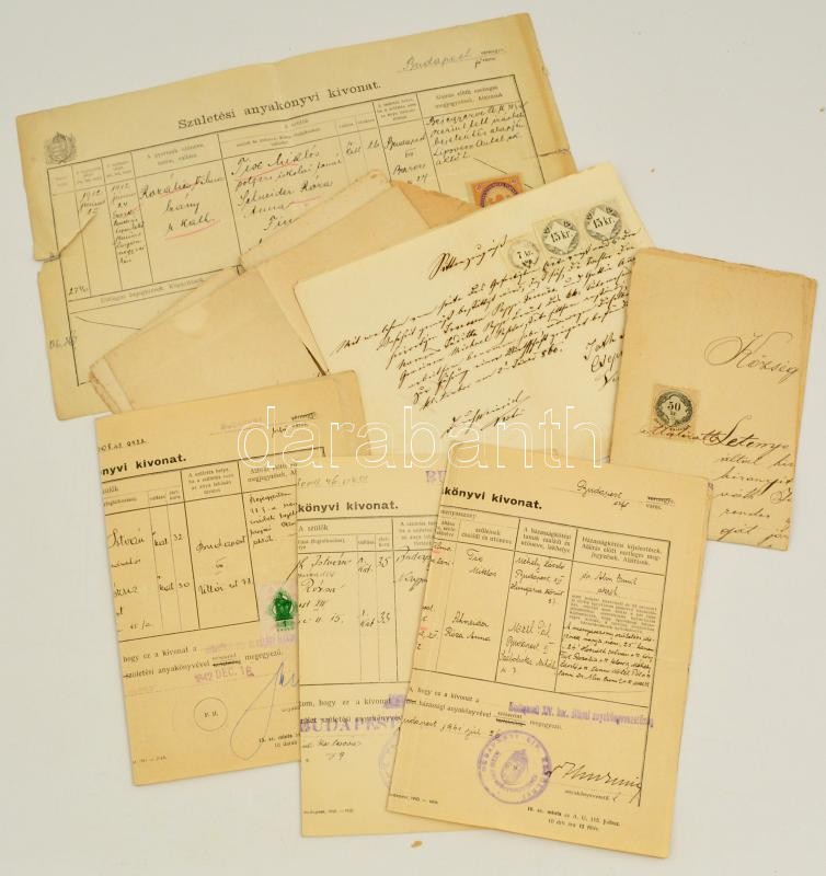 cca 1860-1946 Régi okmányok (9 db) okmánybélyegekkel, a papírok többnyire viseltes, szakadozott állapotban, 1 db 7 kr., 2 db 15 kr., 2 db 50 kr., 1 db 36 kr., 1 db 15 kr., 1 db 25 kr., 1 db 5 kr, 1 db 10 kr., 2 db 1 pengős, 2 db 2 pengős, 1 db 1 ezer adópengő, 2 db 2 ezer adópengős okmánybélyegekkel.