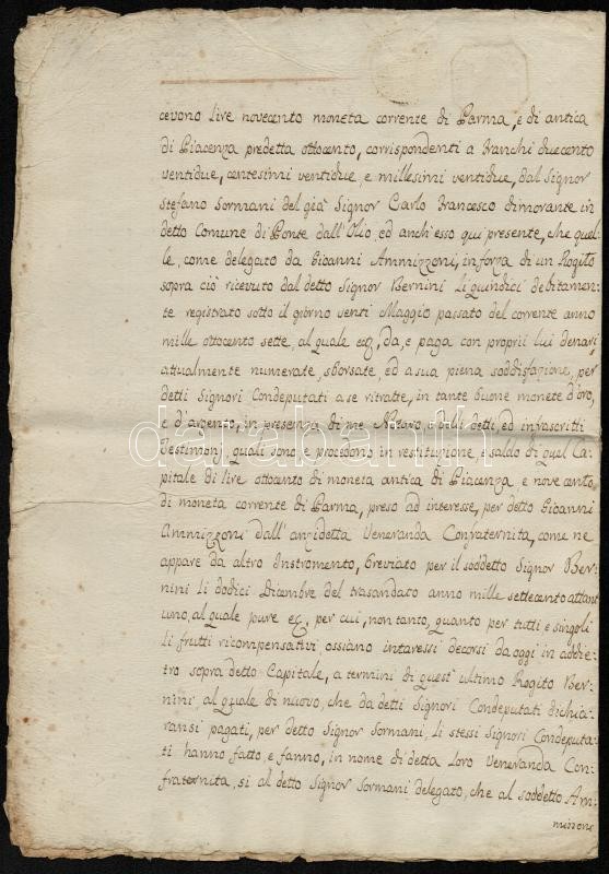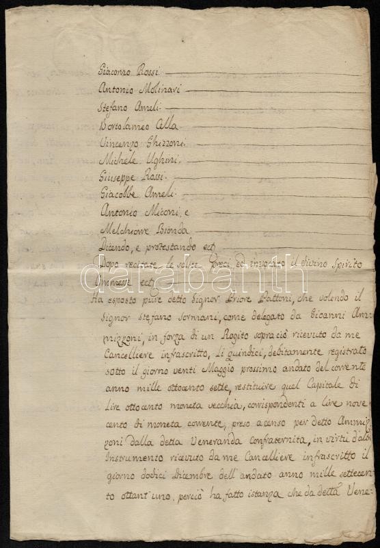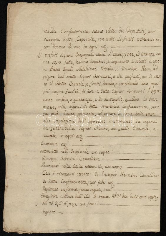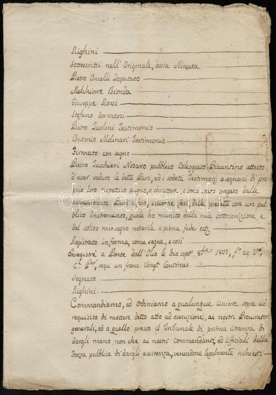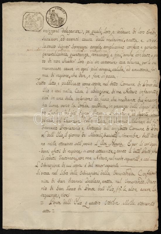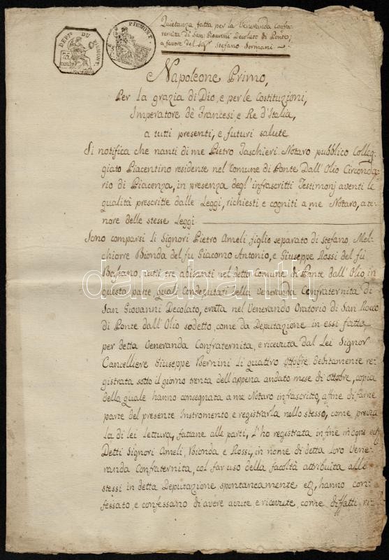 1807 Napóleon oklevele Ponte dell'Olio Keresztelő Szent János-konfraternitásának ügyében, közjegyzői hiteles másolat, szignettával /