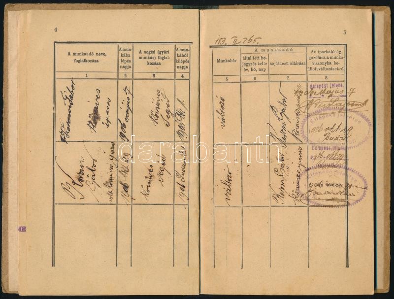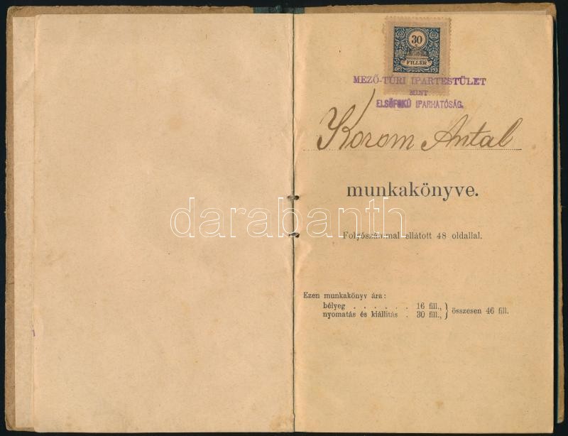 1906 Mezőtúri kőműves segéd munkakönyve, Mezőtúri Ipartestület által k... https://www.darabanth.com/hu/307-Gyorsarveres/307.0/Festmeny-mutargy-papirregiseg-egyeb/Okmanyok~17/1906-Mezoturi-komuves-seged-munkakonyve-Mezoturi-Ipartestulet-altal-kiallitva--viaszpe~II1667566
