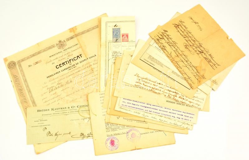 Leírás: cca 1910-1940 vegyes okmány és nyomtatvány tétel: személyes iratok és számlák