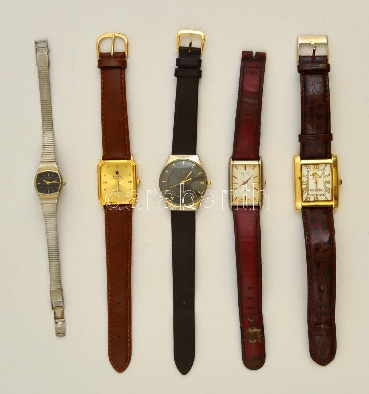 Leírás: 5 db vegyes kvarc óra, replikák és eredetiek, jó bőr szíjakkal