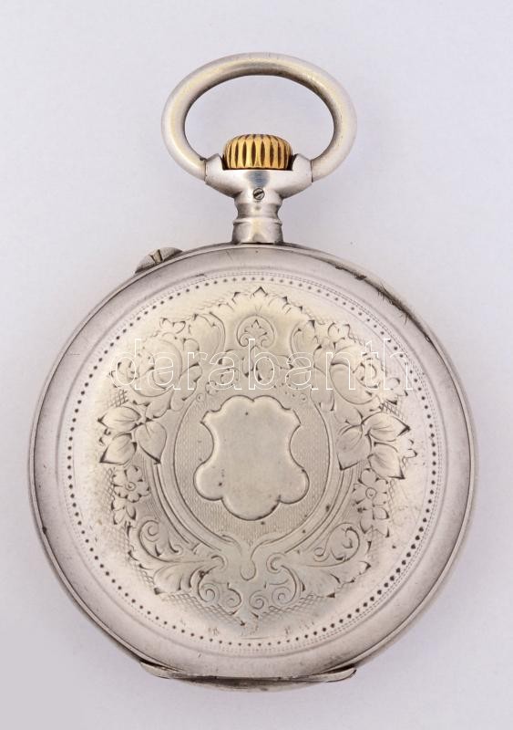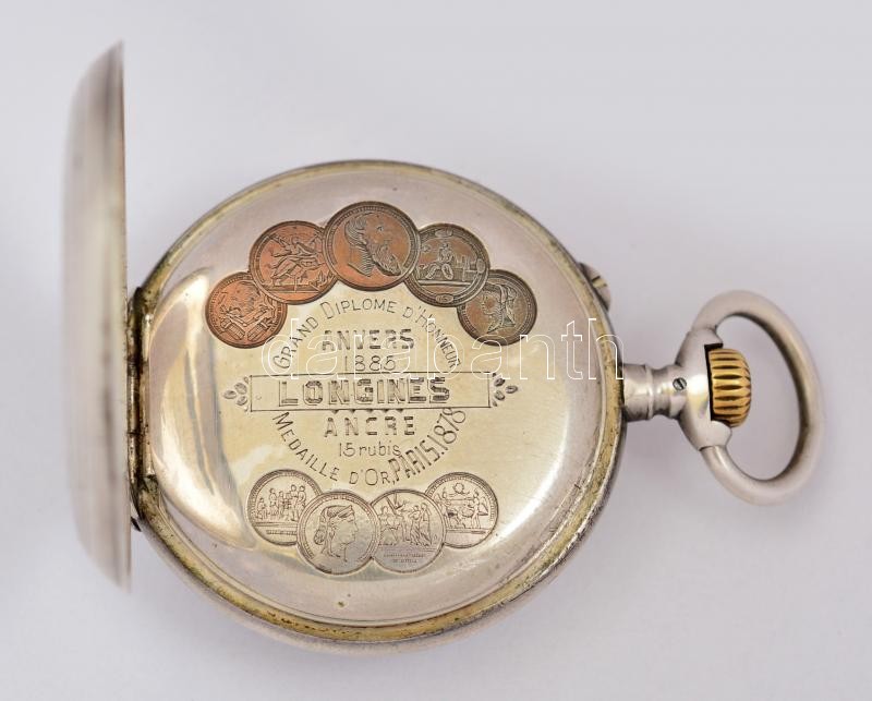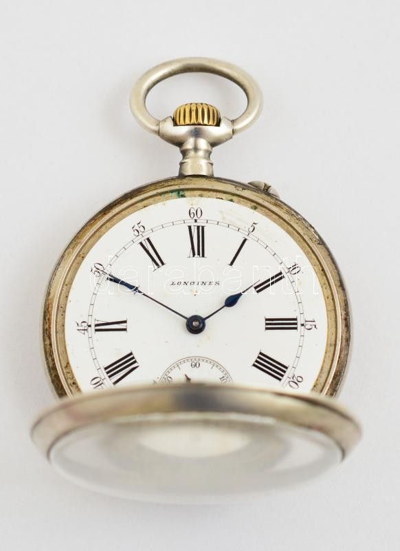 Leírás: Longines dupla ezüst fedeles zsebóra, hibátlan számlappal, szép szerkezettel, Jól működik. / Silver Longines pocket watch. Works well. d:5 cm