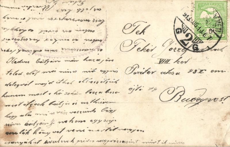 1913 Szatmárnémeti, Satu Mare; Emlék a szatmári szervezett vasmunkások mulatságáról, csoportkép. Tóth Imre fényképész felvétele / Organized Ironworkers' Association's party, group photo + Magyarországi Vas- és Fémmunkások Központi Szövetsége Szatmári helyi csoport pecsét (EK)