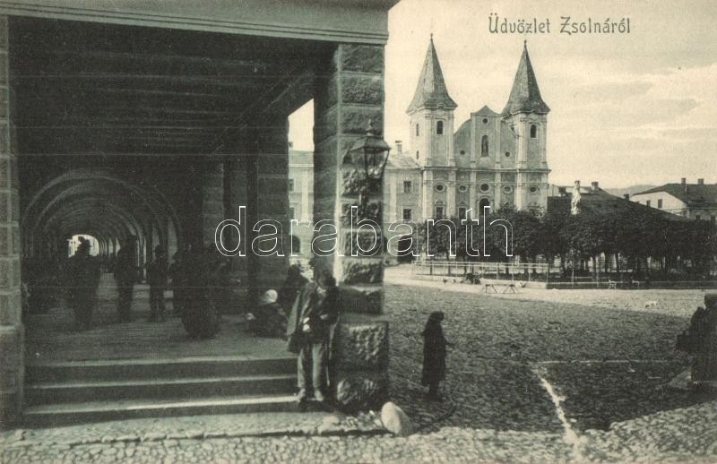 Leírás: Zsolna, Sillein, Zilina; Fő tér, Szent Pál templom, utcakép. Biel és Jellinek kiadása / main square, church, street view