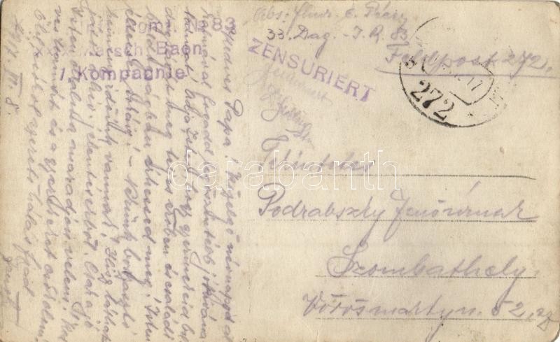 1917 K.u.K. 83. gyalogezred 33. zászlóalj 1. hadserege / WWI K.u.k. In... https://www.darabanth.com/hu/307-Gyorsarveres/307.0/Kepeslapok/Katonai~400080/1917-KuK-83-gyalogezred-33-zaszloalj-1-hadserege-WWI-Kuk-Inftr-Rgmt-No-83-XXXIII-Ma~II1666161