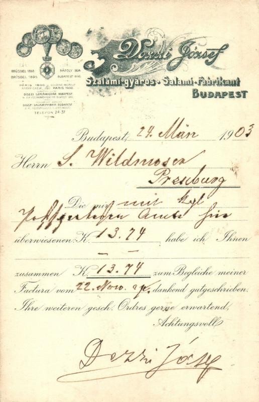 Dozzi József szalámigyáros reklámlapja, Budapest / Hungarian salami fa... https://www.darabanth.com/hu/307-Gyorsarveres/307.0/Kepeslapok/Reklam~400087/Dozzi-Jozsef-szalamigyaros-reklamlapja-Budapest-Hungarian-salami-factorys-advertisement-from~II1661647