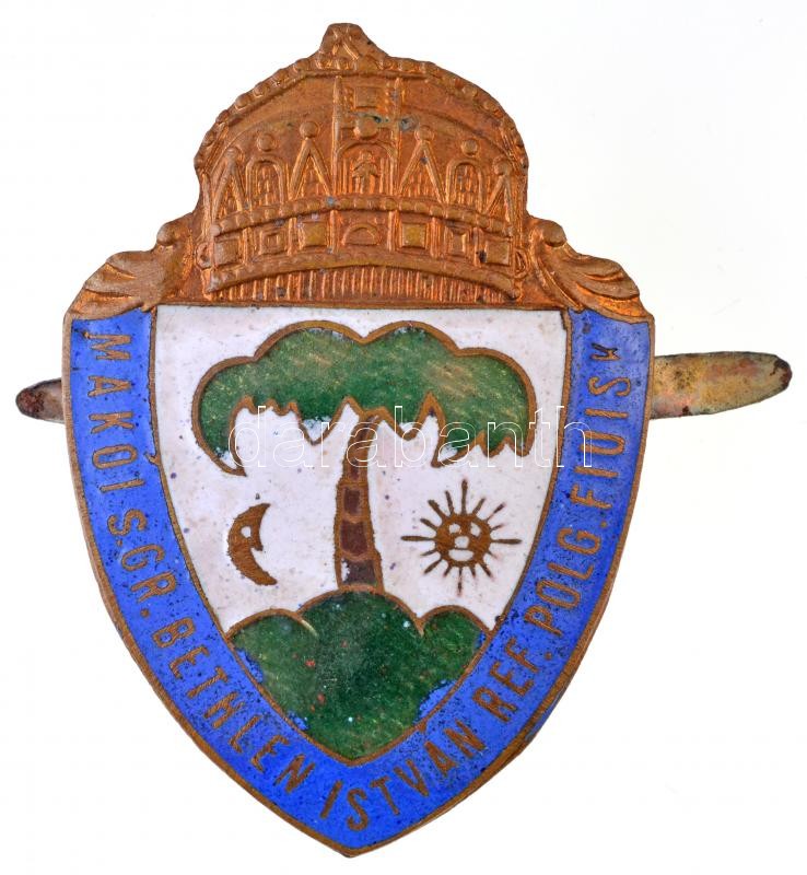 Leírás: ~1930. "Makói s. Gr. Bethlen István Református Polgári Fiúiskola" zománcozott sapkajelvény (35,5x50,5mm) T:2