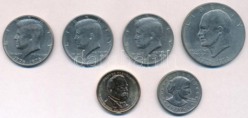 Leírás: Amerikai Egyesült Államok 1971-1979. 1/2$ Cu-Ni "Kennedy" (2xklf) + 1976. 1/2$ Cu-Ni "Kennedy / Bicentennial" + 1976. 1$ Cu-Ni "Eisenhower / Bicentennial" + 1979. 1$ Cu-Ni "Susan B. Anthony" + 2012. 1$ sárgaréz "Elnökök - Grover Cleveland" T:2,2-