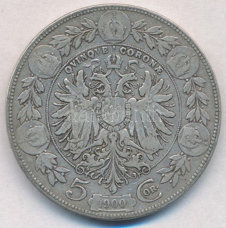 Austria 1900. 5 C... https://www.darabanth.com/hu/307-Gyorsarveres/307.0/Numizmatika/Kulfoldi-fem-es-ezustpenzek~300013/Ausztria-1900-5K-Ag-Ferenc-Jozsef-T2---Austria-1900-5-Corona-Ag-Franz-Joseph-CVF---Krause-K~II1663969