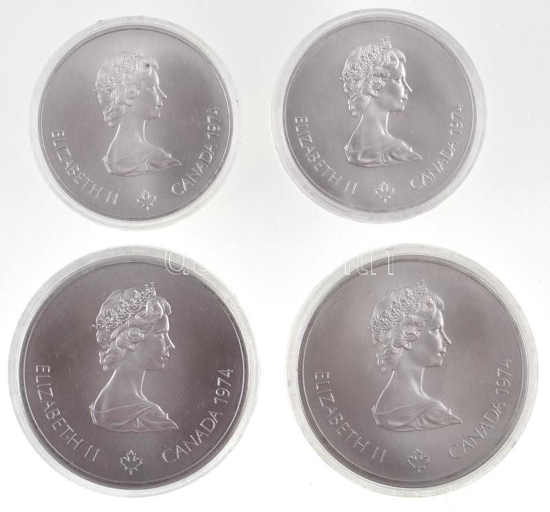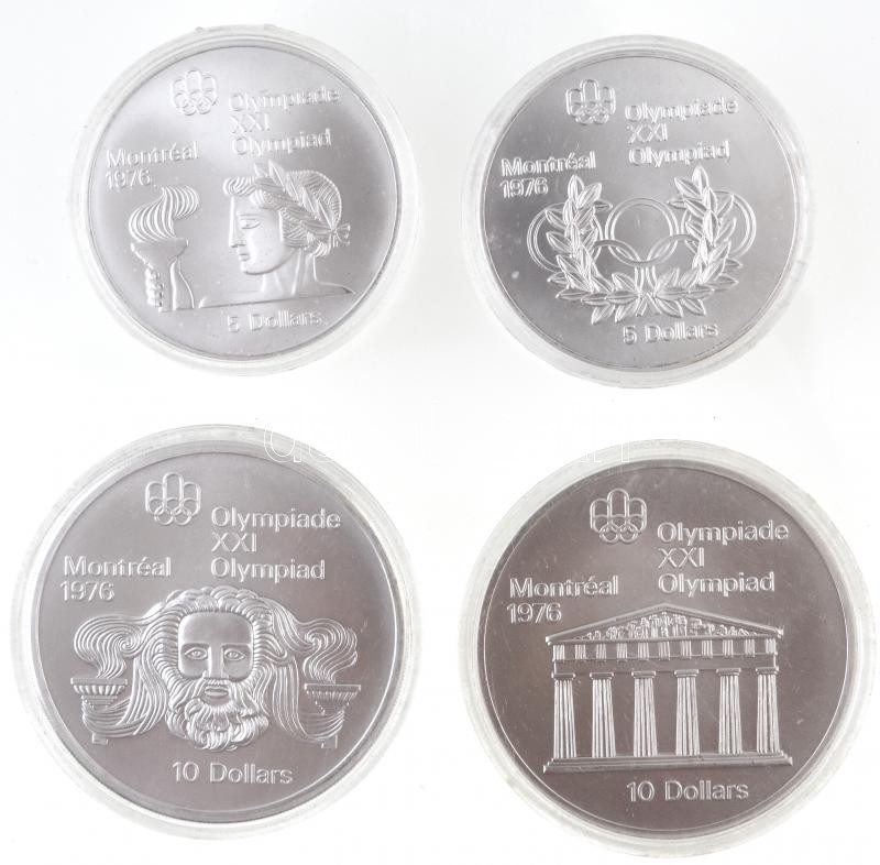 Kanada 1974. 5$ Ag (2x) "Atléta fáklyával", "Olimpiai karikák"+ 10$ Ag (2x) "Zeus fej", "Zeus templom"; "Montreali Olimpia" sorozat eredeti dísztokban T:1