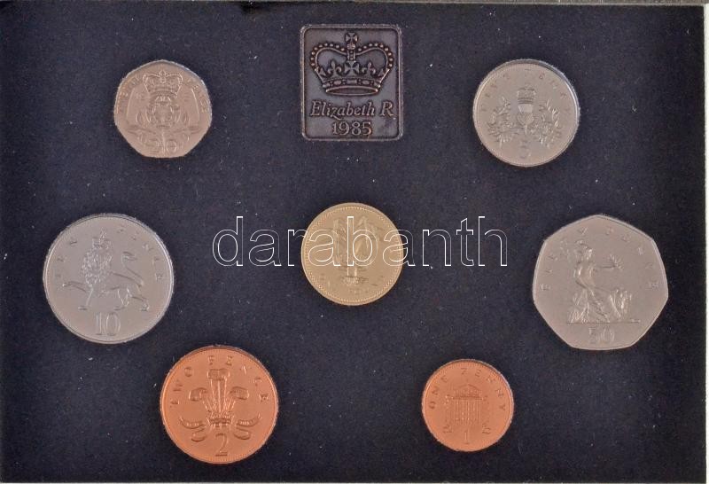 Great Britain 1985. 1 Penny - 1 Pound (7xdiff) coin set in sealed case, in foldable faux lether case with information sheet C:PP spotted