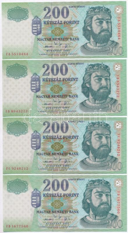 2005. 200Ft (4x) "FA", "FB", "FC", "... https://www.darabanth.com/hu/307-Gyorsarveres/307.0/Numizmatika/Magyar-bankjegyek~300007/2005-200Ft-4x-FA-FB-FC-FD-sorozatjel-TI~II1660307