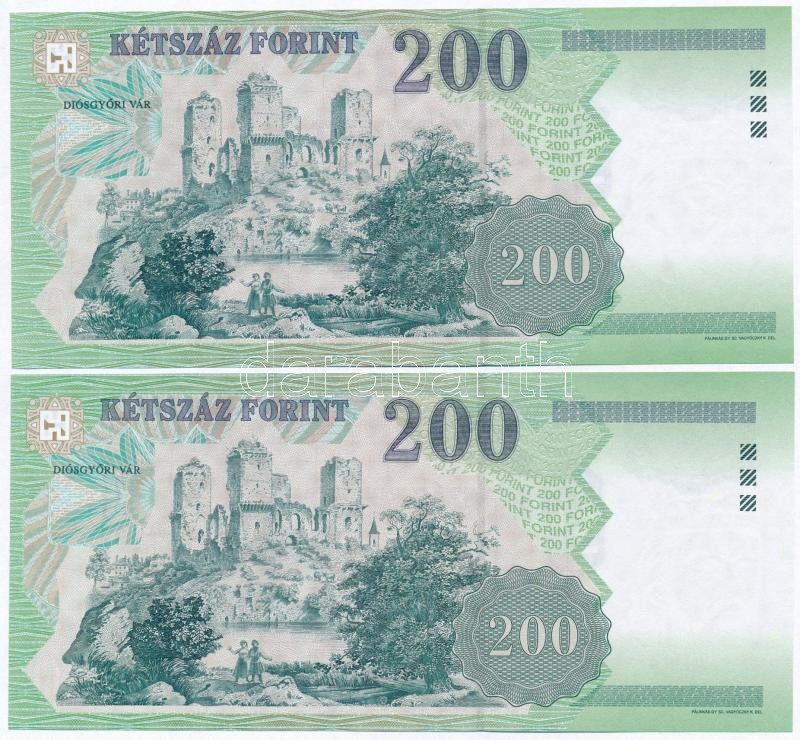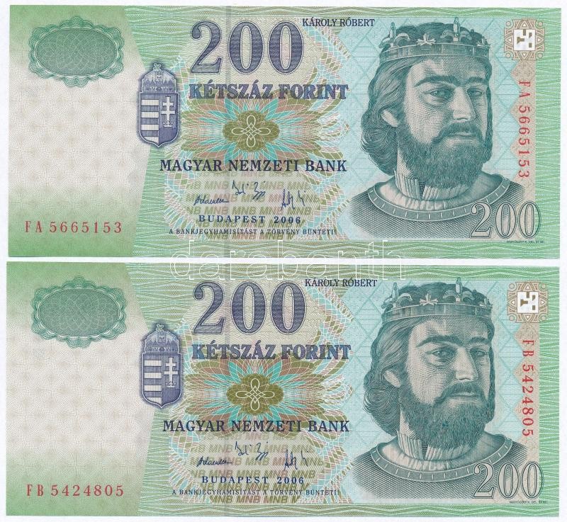 2006. 200Ft (2x) "FA", "FB" sorozatjel T:I https://www.darabanth.com/hu/307-Gyorsarveres/307.0/Numizmatika/Magyar-bankjegyek~300007/2006-200Ft-2x-FA-FB-sorozatjel-TI~II1660312