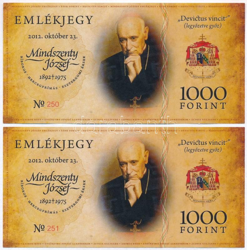 Leírás: 2012. 1000Ft "Mindszenthy József Emlékjegy" (2x) sorszámkövetők T:I,I-