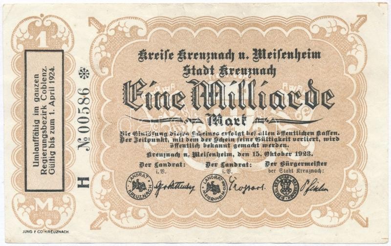 Leírás: Németország / Weimari Köztársaság / Kreuznach 1923. 1.000.000.000M szükségpénz T:III