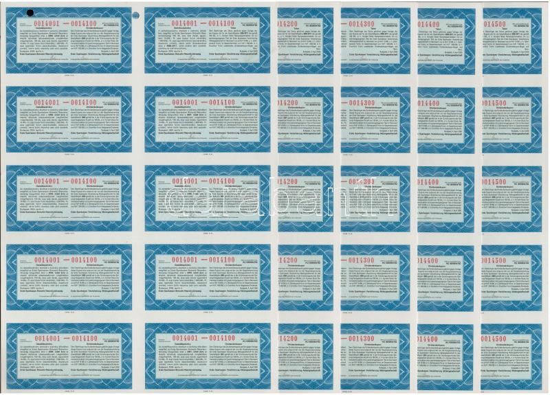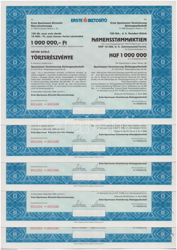 Budapest 2000. "Erste Sparkassen Biztosító Részvénytársaság" 100 db részvénye összesen 1.000.000Ft értékben, magyar és német nyelven, szárazpecséttel és szelvényekkel, lyukasztással érvénytelenítve (5x) sorszámkövetők T:I,I-